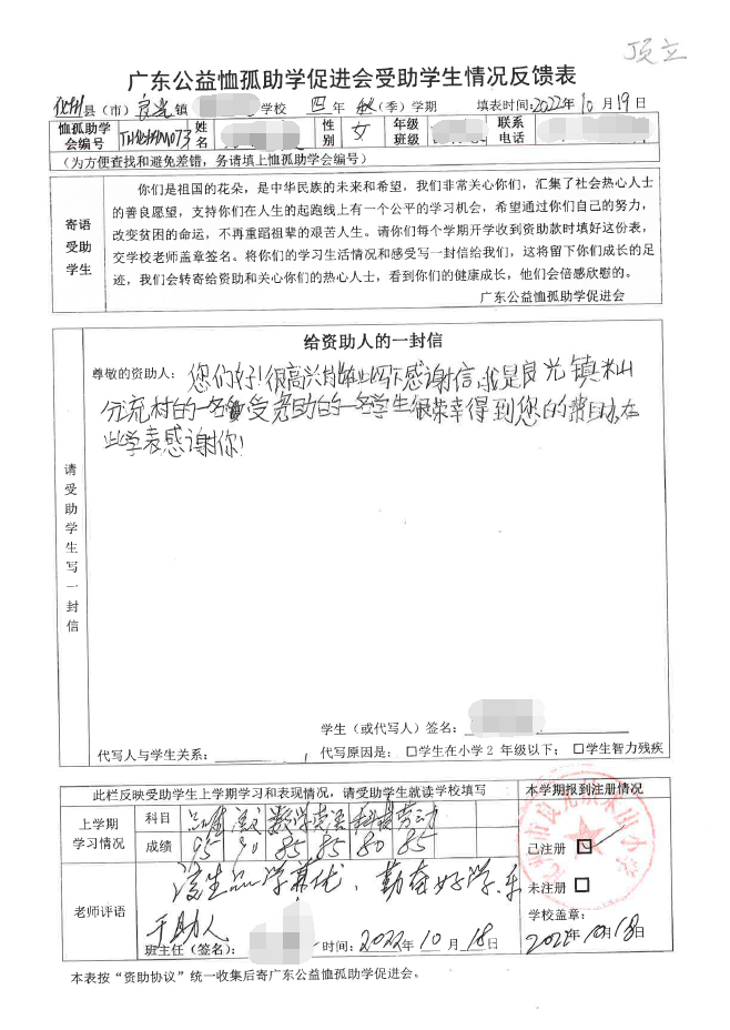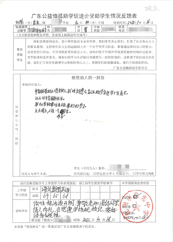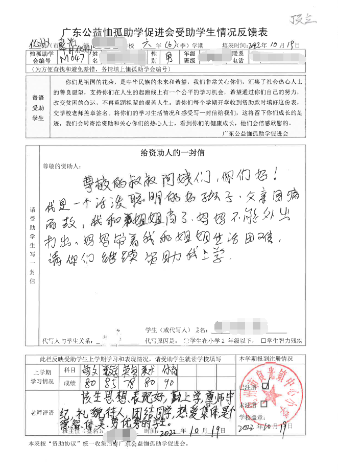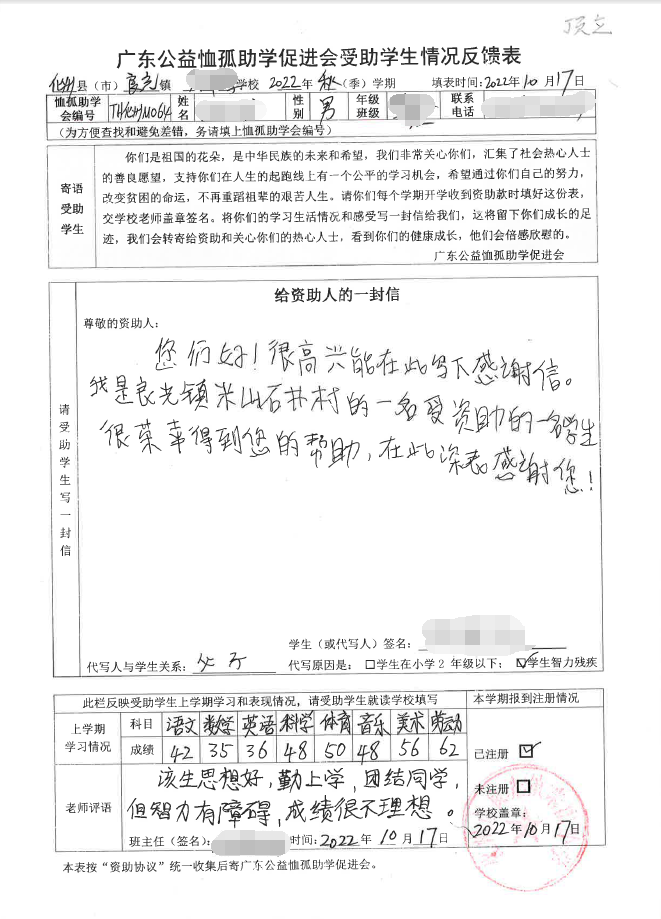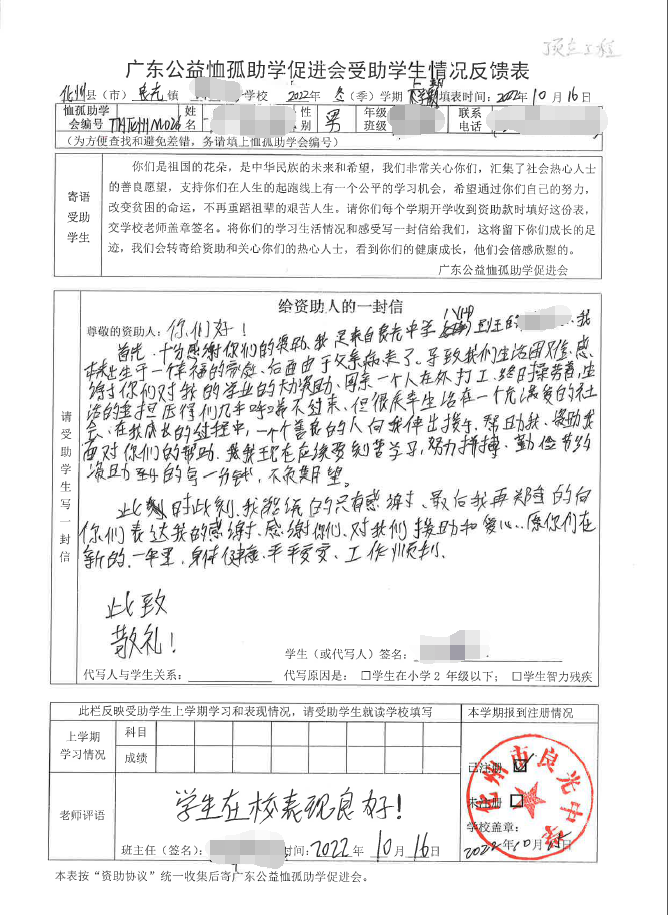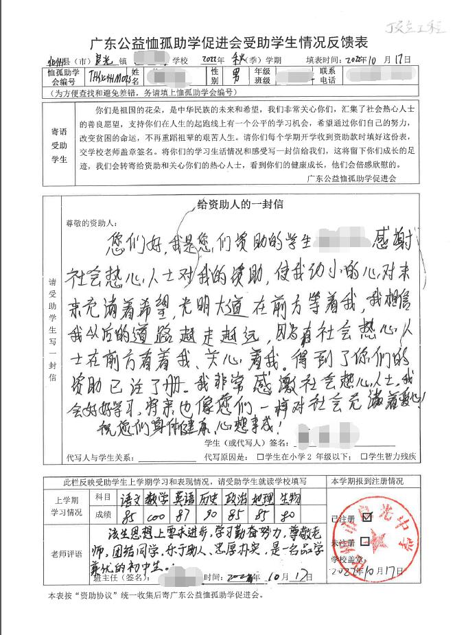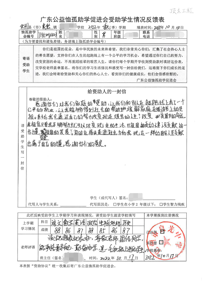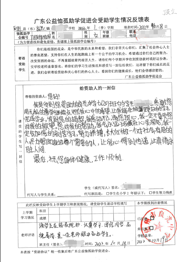 2022年7月,公司了解到廣東公益恤孤助學(xué)促進會舉辦慈善助學(xué)活動之后,發(fā)起了公司內(nèi)部慈善捐款活動,員工們積極參與,紛紛捐款,向有需要的學(xué)生奉獻愛心,向他們表達一份關(guān)愛。也許我們的愛心微不足道,但卻緩解了他們在學(xué)業(yè)上一定程度的經(jīng)濟壓力,改善了他們的學(xué)習(xí)和生活環(huán)境,也給他們帶來了希望。近期,廣東公益恤孤助學(xué)促進會將學(xué)生情況反饋表及受助學(xué)生對捐助人的一封信郵寄到公司,反饋了受助學(xué)生的學(xué)習(xí)生活情況,反饋表及信函里記錄著受助學(xué)生對學(xué)習(xí)的熱愛,也表達著他們對捐助人的感激之情,可以說我們小小的舉動給他們帶來了莫大的支持。